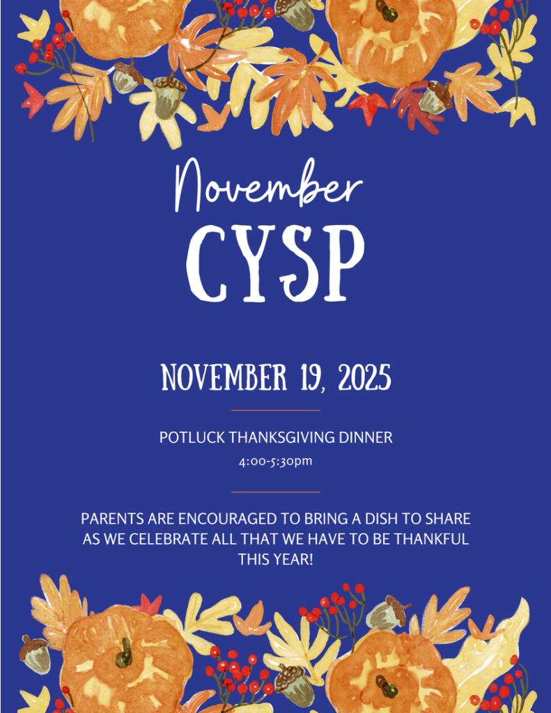 | It’s already November and CYSP is off to a strong start. Students have been enhancing their reading and math skills and also participating in character education and cultural exposure lessons. They have also enjoyed participating in physical activities! November is a busy month for CYSP as in addition to having CYSP after school on Wednesday, November 5, 2025 from 3:45 p.m. – 5:45 p.m., we will also be having a potluck Thanksgiving dinner on Wednesday, November 19, 2025 from 4:00 – 5:30 p.m. Parents are encouraged to bring a dish to share as we will be celebrating all that we have to be thankful for this year. |